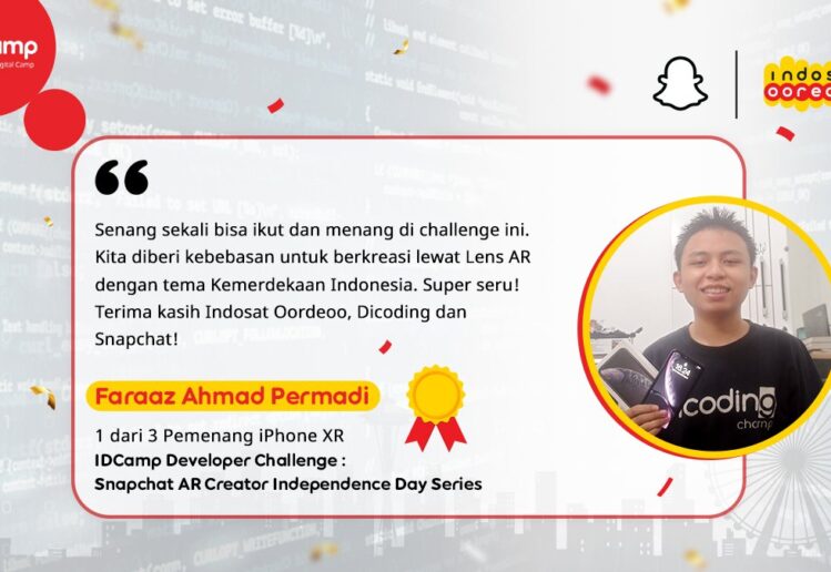 Awalnya challenge yang diadakan IDCamp, Dicoding dan Snapchat itu hanya memberikan hadiah sebesar 2500 point atau setara Rp 2.500.000,- pada website dicoding, tetapi 2 atau 3 minggu setelah poster itu dirilis, IDCamp, Dicoding dan Snapchat mengumumkan bahwa hadiah ditambah khusus untuk 3 filter snapchat terbaik, dimana pemenangnya bisa mendapatkan iPhone XR secara gratis. Disini aku semakin semangat dan mencoba membuat banyak sekali filter snapchat dengan konsep kemerdekaan Indonesia dan mengunggahnya ke submission challenge tersebut di situs Dicoding.